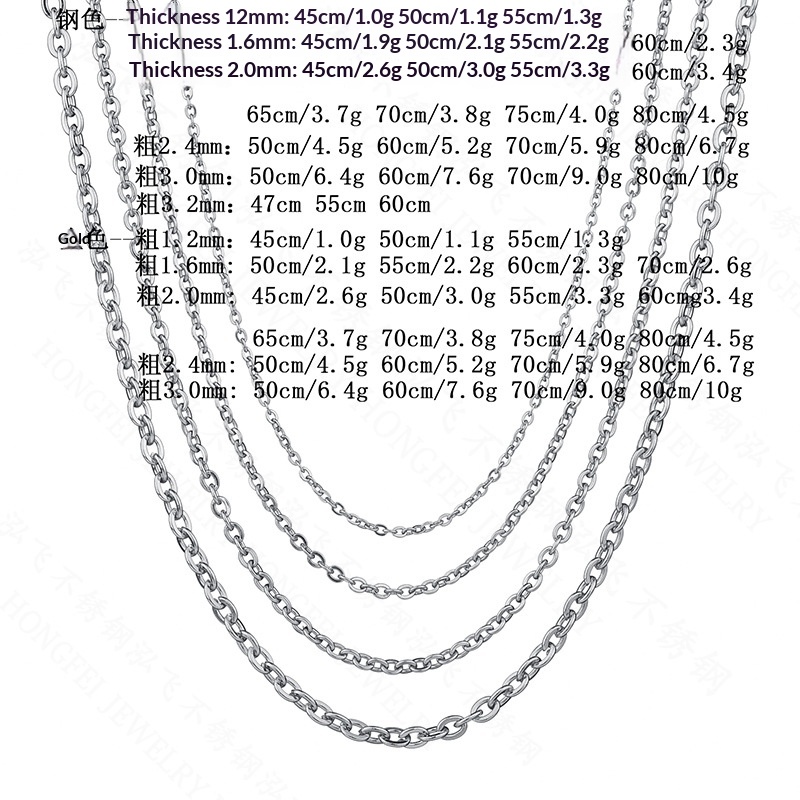 Colors: Steel color 1.2mm*45cm, steel color 1.2mm*50cm, steel color 1.2mm*55cm, gold color 1.2mm*45cm, gold color 1.2mm*50cm, gold color 1.2mm*55cm, steel color 1.6mm*45cm, steel color 1.6mm*50cm, steel color 1.6mm*55cm, steel color 1.6mm*60cm, gold color 1.6mm*50cm, gold color 1.6mm*55cm, gold color 1.6mm*60cm, gold color 1.6mm*70cm, rose gold 2.0mm*50cm, steel color 2.0mm*45cm, steel color 2.0mm*50cm, steel color 2.0mm*55cm, steel color 2.0mm*60cm, steel color 2.0mm*65cm, steel color 2.0mm*70cm, steel color 2.0mm*75cm, steel color 2.0mm*80cm, gold color 2.0mm*45cm, gold color 2.0mm*50cm, gold color 2.0mm*55cm, gold color 2.0mm*60cm, gold color 2.0mm*70cm, gold color 2.0mm*75cm, steel color 2.4mm*50cm, steel color 2.4mm*60cm, steel color 2.4mm*70cm, steel color 2.4mm*80cm, gold color 2.4mm*50cm, gold color 2.4mm*60cm, gold color 2.4mm*70cm, gold color 2.4mm*80cm, steel color 3.0mm*50cm, steel color 3.0mm*60cm, steel color 3.0mm*70cm, gold color 3.0mm*50cm, gold color 3.0mm*60cm, gold color 3.0mm*70cm, gold color 3.0mm*80cm.